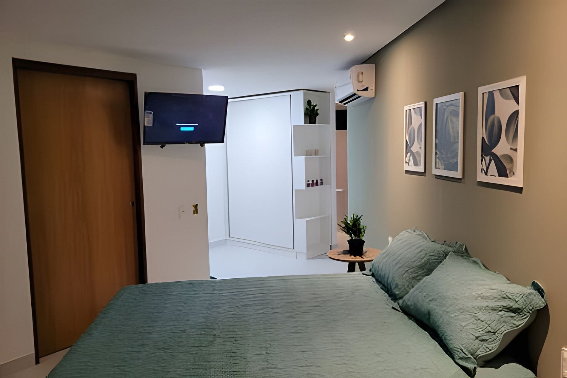 Apartamento tipo Studio, no quarto temos uma cama de casal e uma de solteiro com auxiliar, total de 3 camas